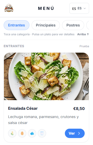 Cumple la ley mostrando iconos claros de alérgenos en cada plato.